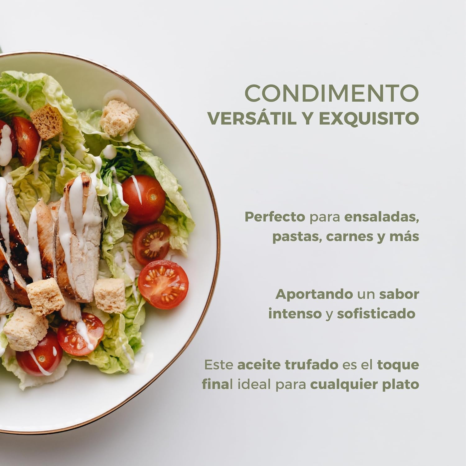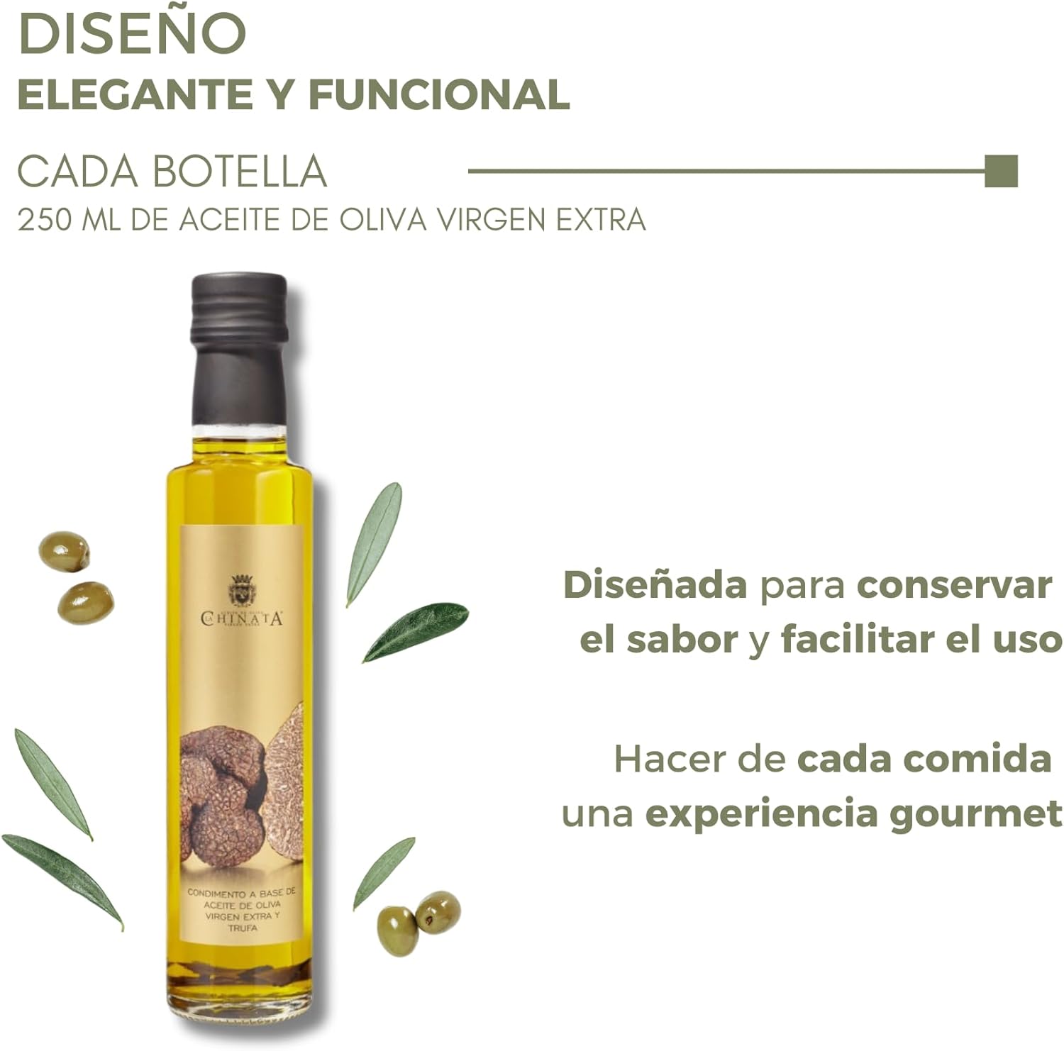 Para usar como condimento, verter una pequeña cantidad sobre platos de pasta, ensaladas o carnes. Almacenar en un lugar fresco y seco, alejado de la luz solar directa y fuentes de calor. Cerrar la botella después de cada uso. Este producto es seguro para la mayoría de las personas, pero si es alérgico a los aceites de oliva, no lo consuma