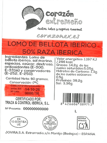 Los ingredientes son: lomo de cerdo de bellota, sal marina, pimentón, ajo.