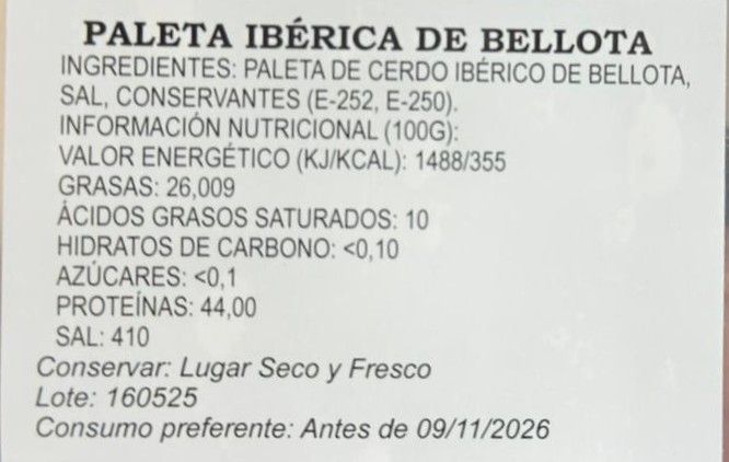 Jamón de bellota ibérico, sal marina, antioxidante (E-301) y conservadores (E-250, E-252).