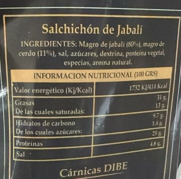 Magro de jabalí 80%, magro de cerdo 11%, sal azúcares , dextrina,proteína vegetal, especias,aromas natural